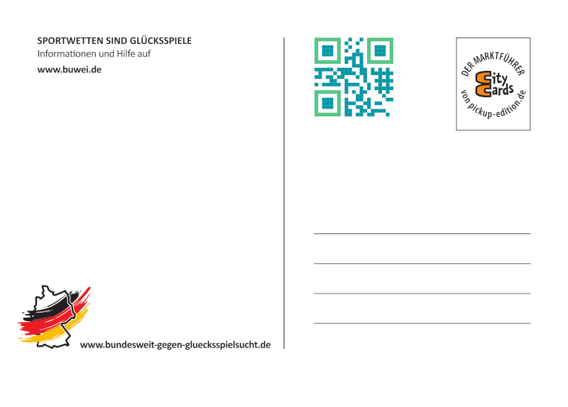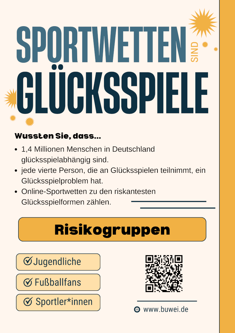 Die Bundeszentrale für gesundheitliche Aufklärung (BZgA) bietet eine Vielzahl von Informationsmaterialien an, die kostenlos bestellt werden können oder auch als Datei zum Download bereit stehen. www.bzga.de/infomaterialien/gluecksspielsucht/